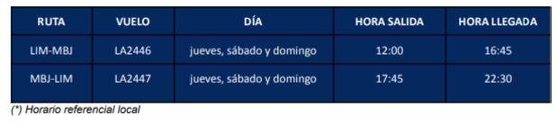 La ruta contará con tres vuelos a la semana, los días jueves, sábado y domingo, permitiendo a los pasajeros provenientes de Santiago, Buenos Aires, Sao Paulo, Asunción, Montevideo, Córdoba y Mendoza, realizar la conexión en Lima para llegar a Montego Bay. El vuelo tiene una duración de alrededor de 5 horas y será operado en aeronaves A319 y A320, con capacidad para 138 y 174 pasajeros, respectivamente.