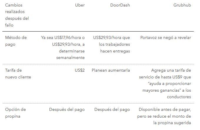 Las empresas pueden elegir qué tarifa pagar a los conductores. Uber tomará esa decisión semanalmente. En la semana que finalizó el 11 de diciembre, utilizó la tasa de US$ 29.93 dólares, al igual que DoorDash. Grubhub se negó a revelar detalles sobre cómo pretende cumplir con la regla.