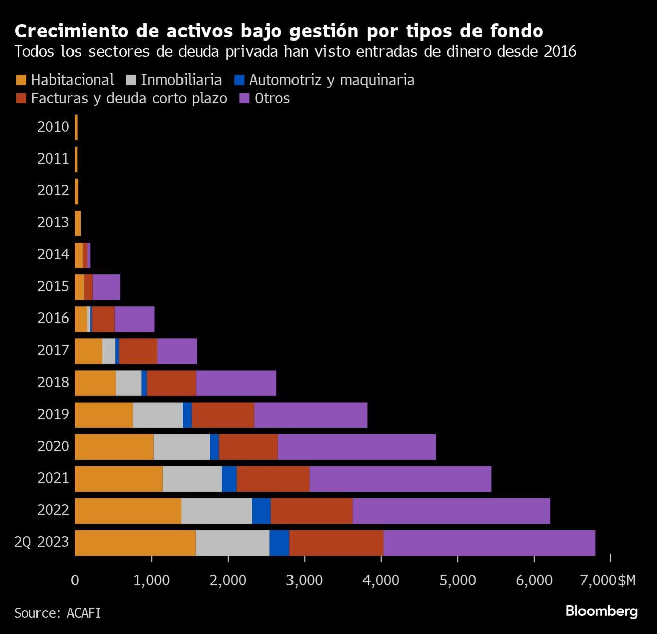 Los fondos de deuda privada que rastrea la ACAFI incluyen financiamiento directo para vivienda, inmobiliaria, automóviles y maquinaria, facturas y deuda de corto plazo y otros.